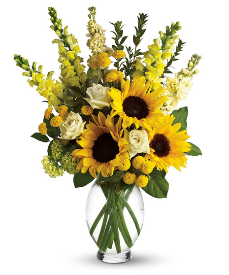 Here comes the sun...and a whole lotta lovely flowers! This large bouquet of mixed yellow flowers is a sunny way to say, "Get well soon," "I miss you," or simply, "Hello!" A wide, wonderful variety of blooms including sunflowers, roses, snapdragons, stock, button spray chrysanthemums and viburnum are mixed with greens such as myrtle, salal and pittosporum. Approximately 18" W x 25" H. for delivery outside Billings