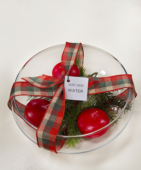 Create instant holiday ambiance with our Just Add Water floating candle kit. This elegant set includes a low, shallow glass bowl, three red floating candles, and evergreens - everything you need to craft a warm, glowing centerpiece with minimal effort.