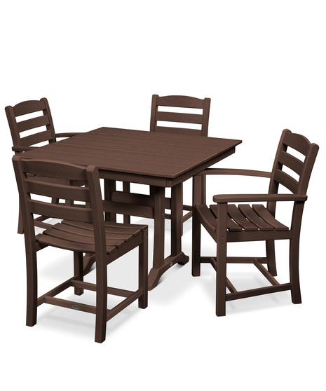 Gather around the table for a laid back meal outdoors with the La Casa Café 5-Piece Farmhouse Dining Set with Trestle Legs. This classic set seats up to four guests for a relaxed outdoor dining experience. The La Casa Café Dining Chairs are contoured for comfort while the Farmhouse 37" Dining Table provides plenty of legroom underneath.