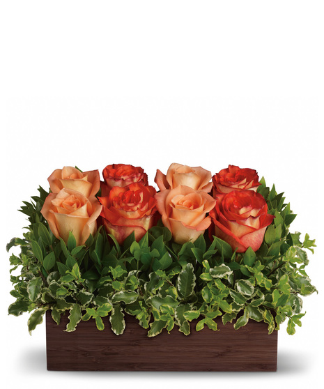 A truly sophisticated rose garden befitting an uptown apartment, this modern rose arrangement pairs dark orange roses with soft peach roses in a dark bamboo vase. Perfectly arranged pitta negra and myrtle add to the upscale look. A dark, rectangular bamboo box vase holds dark orange roses, peach roses, and a lavish amount of pitta negra and myrtle greens. Approximately 14" W x 9 1/2" H.